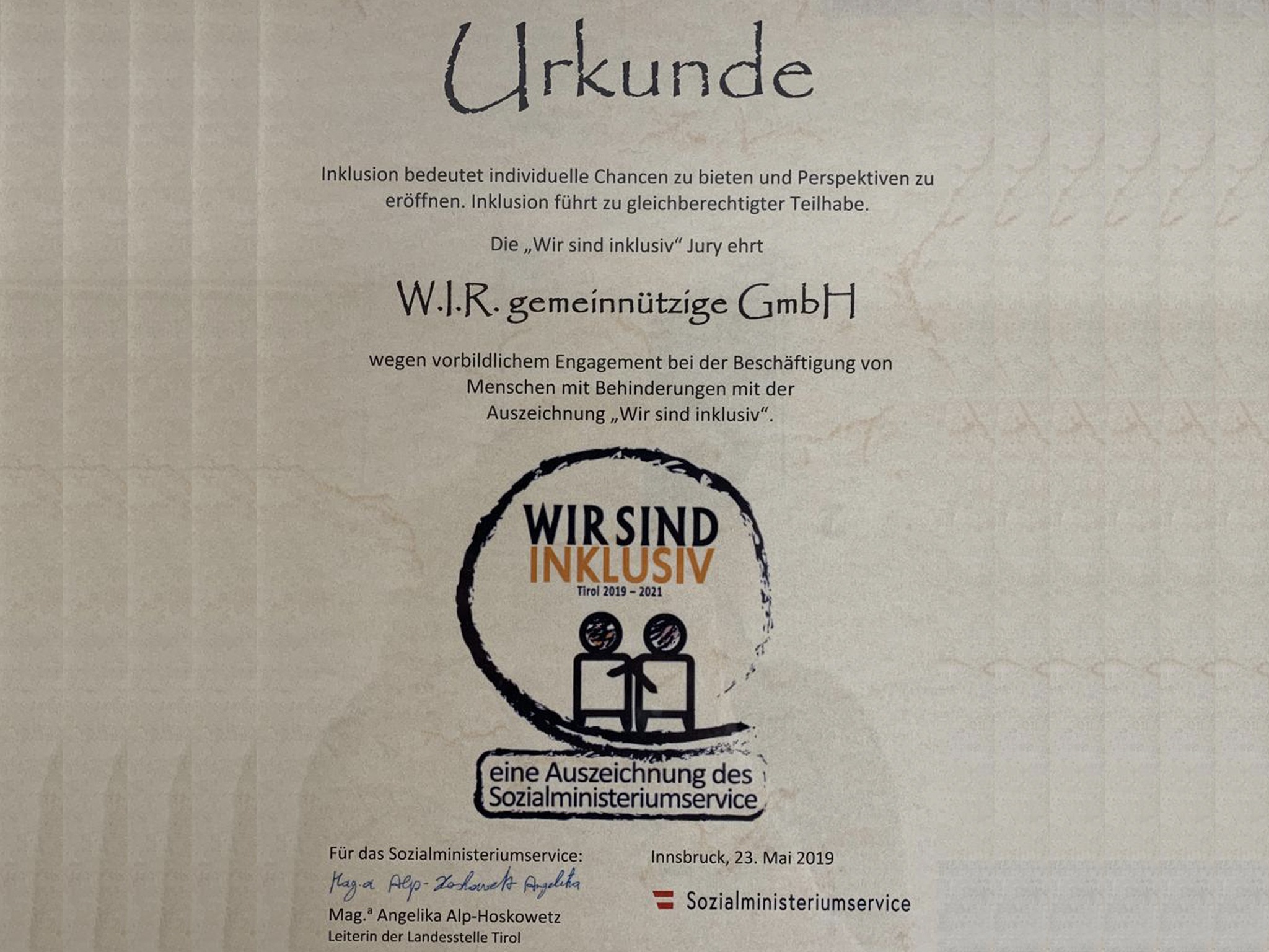 Kürzlich erhielt die W.I.R. gemeinnützige GmbH gemeinsam mit 22 anderen Tiroler Unternehmen, wieder die Auszeichnung „Wir sind inklusiv“. Die Auszeichnung…